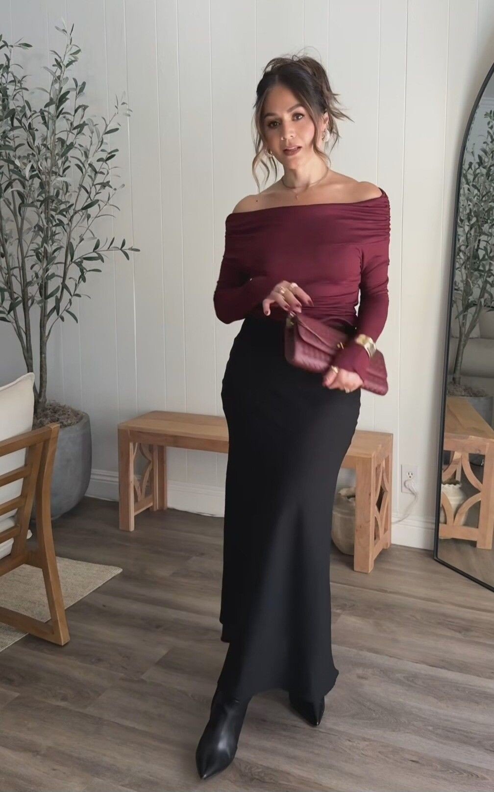 This sophisticated ensemble strikes the perfect balance between elegance and edge for winter bar nights. The burgundy off-shoulder top drapes beautifully while maintaining a chic, flattering silhouette, while the flowing black maxi skirt adds dramatic flair and winter-appropriate coverage.