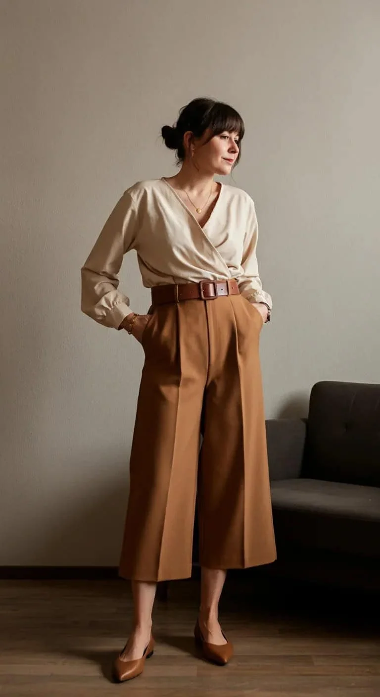 Camel-colored culottes create a sophisticated foundation.