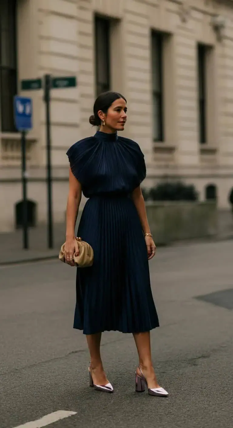 A navy pleated midi dress with unique neckline details stands out.